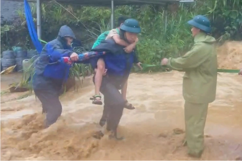 (Dân trí) – Tại xã Trà Linh, mưa to đến rất to khiến nước chảy trên đường như thác đổ. Lực lượng chức năng rất vất vả đưa người dân đến nơi an toàn.