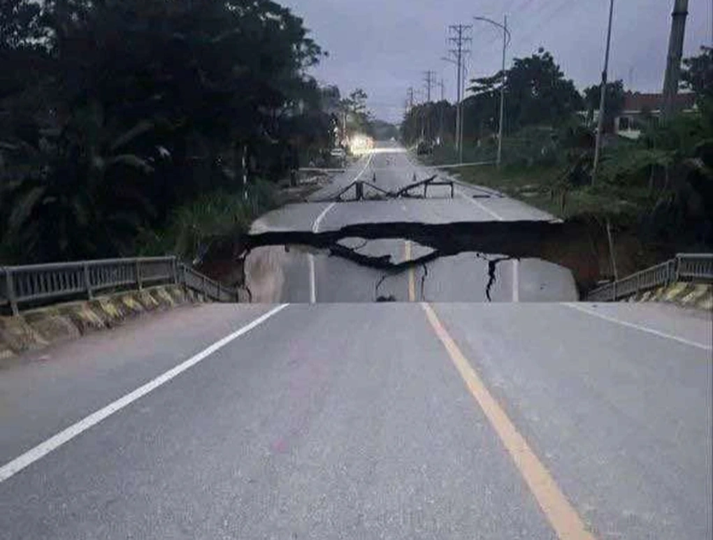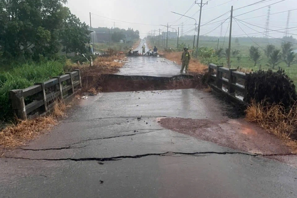 Sau cơn mưa lớn, một phần cây cầu trên đường số 40, phường Chơn Thành, bị sập, sụt lún khiến người dân không thể lưu thông qua khu vực.
